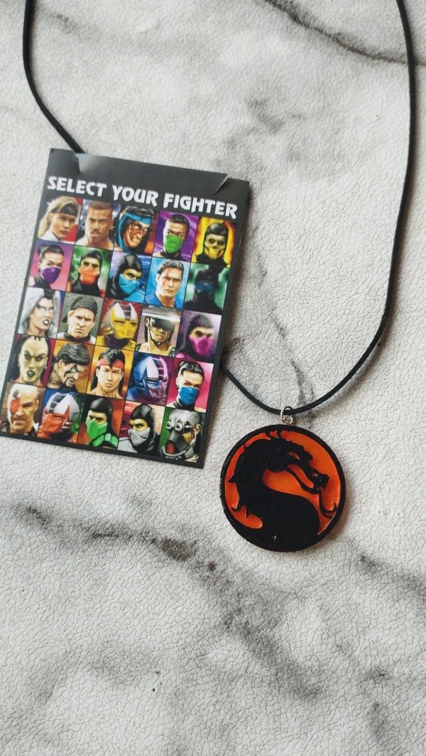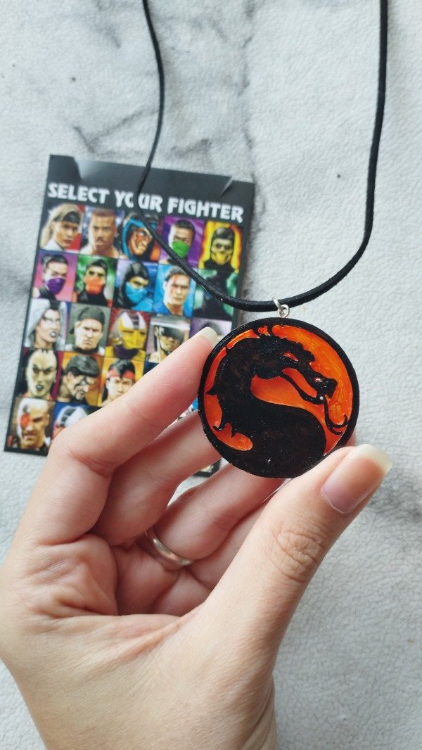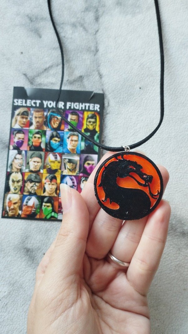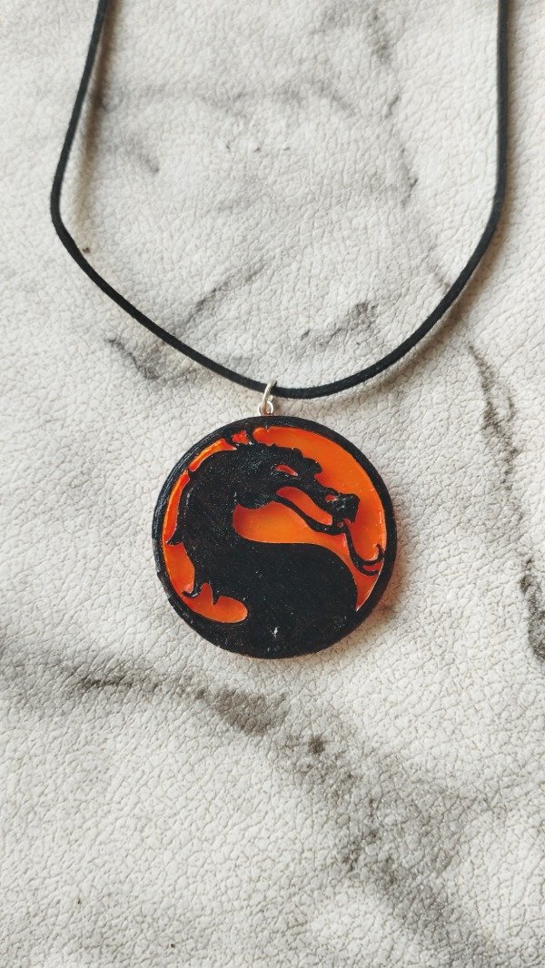 Diseño realizado en resina, con detalles en acrílico y barniz. Con colgante de gamuza negra.