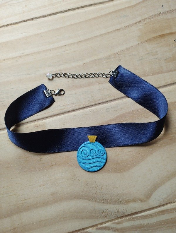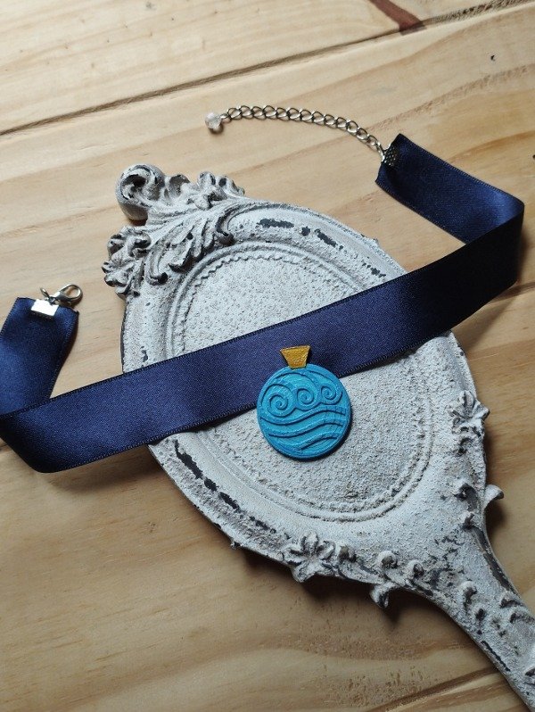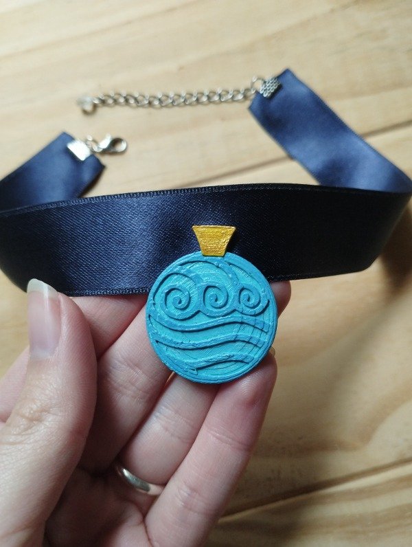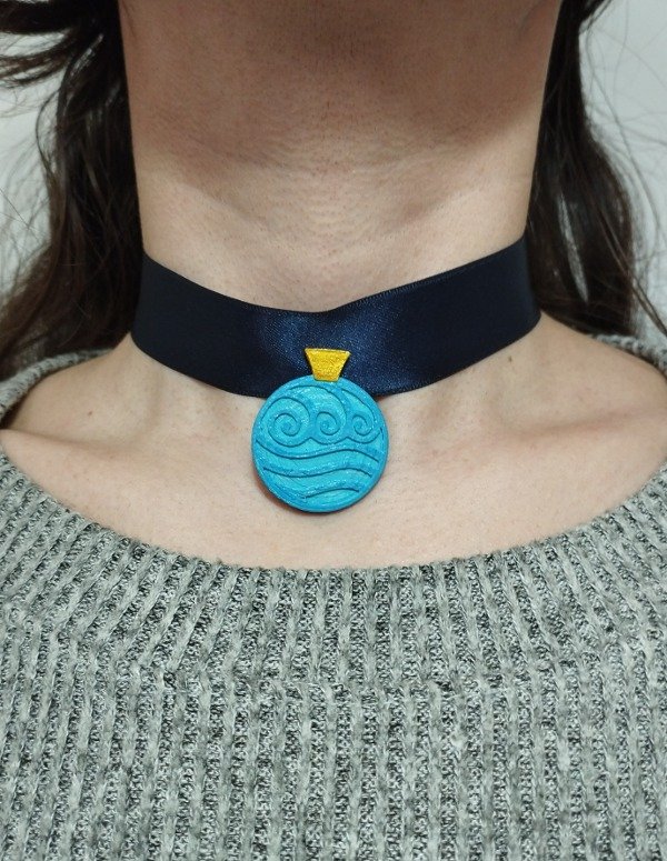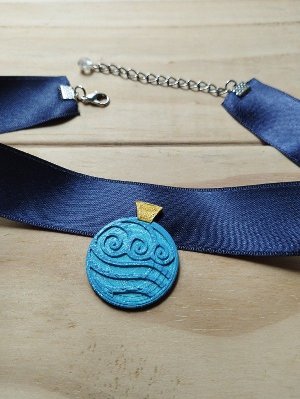 Hecho en impresión 3D con detalles en acrílico. Con cinta de raso azul y cadena para ajustar al cuello en la medida deseada.