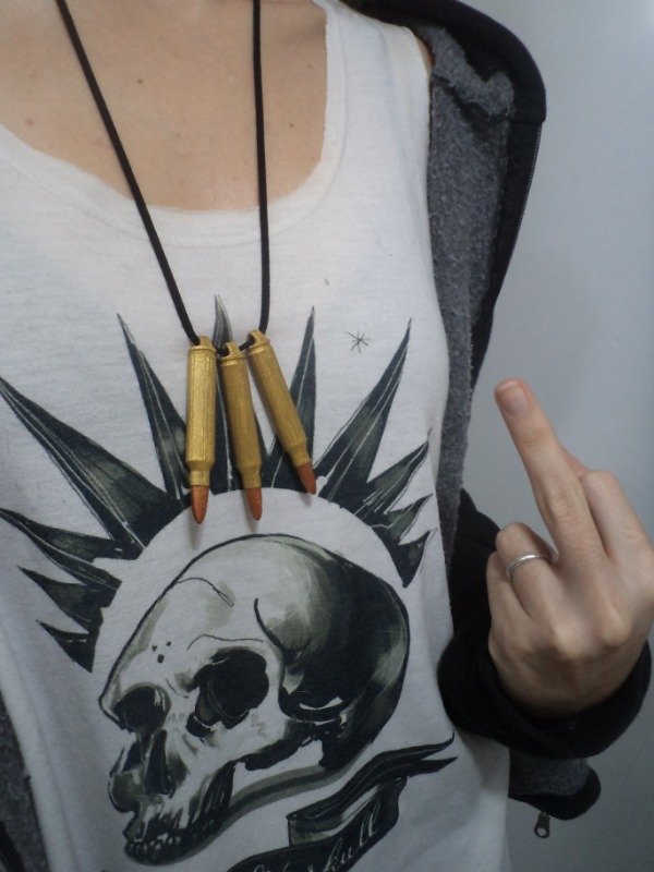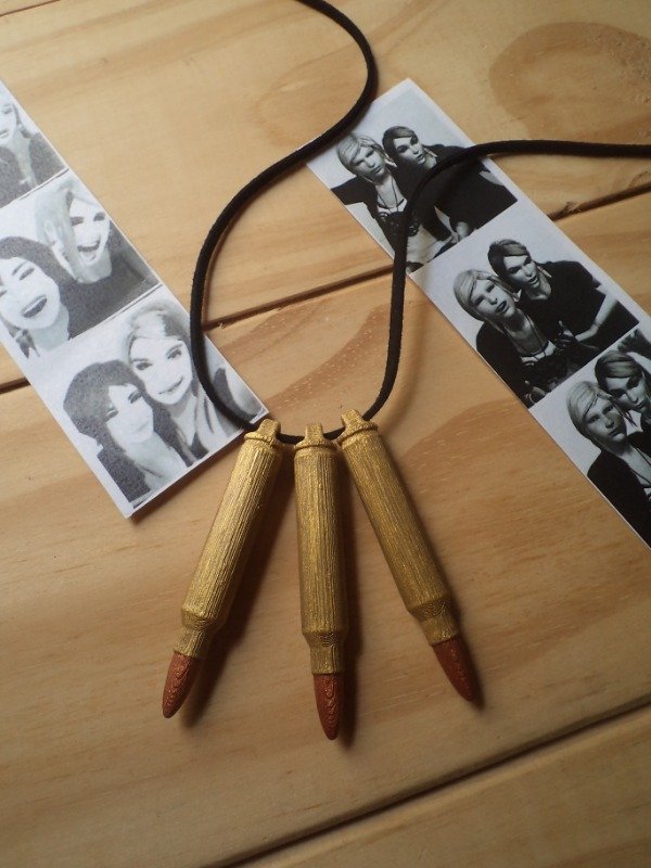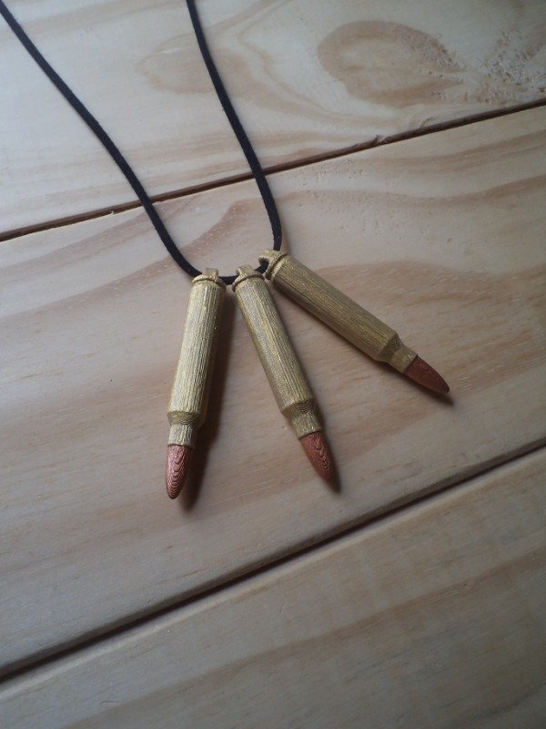 Hecho en impresión 3D con detalles en acrílico. Lleva una tira de gamuza negra.