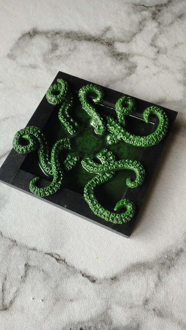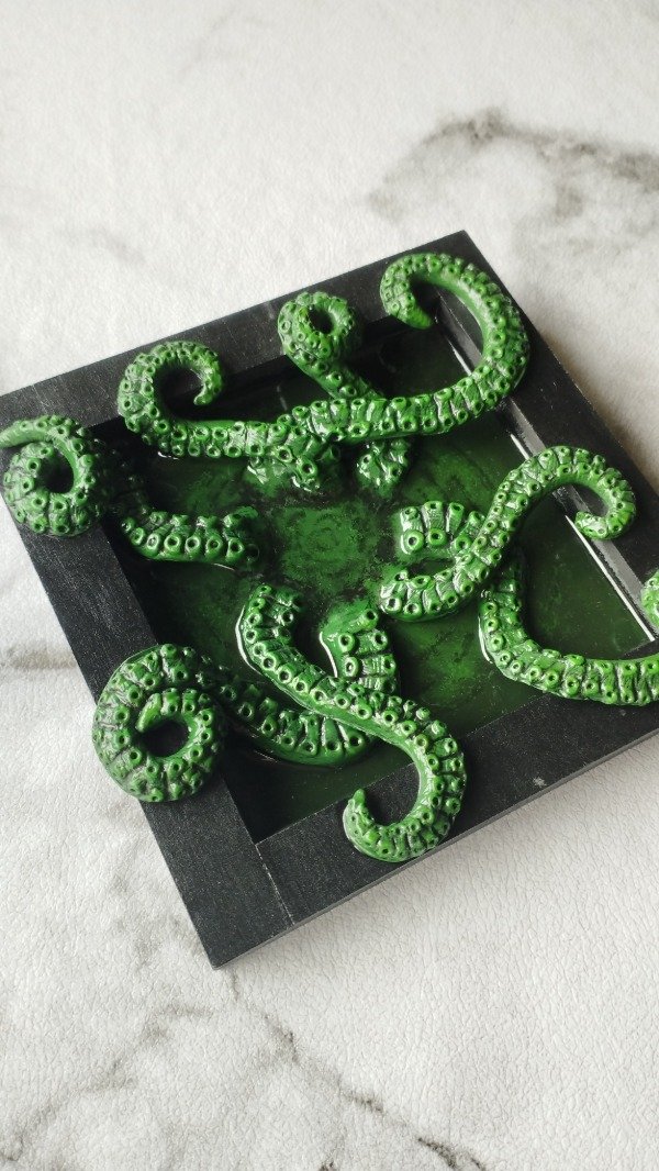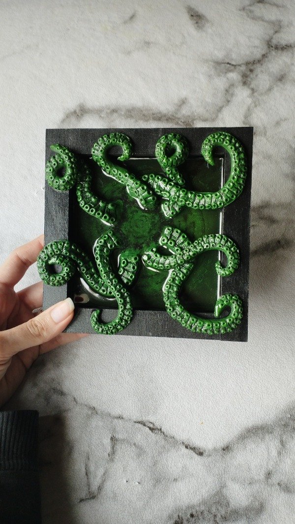 Cuadro de madera con diseño realizado en porcelana fría, resina, detalles en acrílico y barniz. Lleva gancho de metal en la parte de atrás para poder colgar.