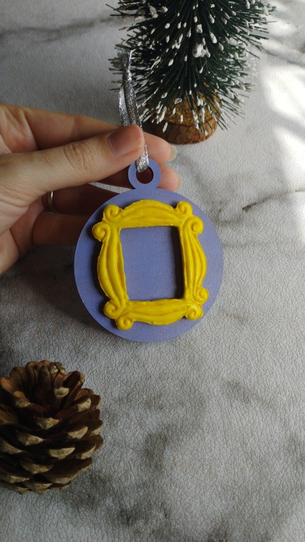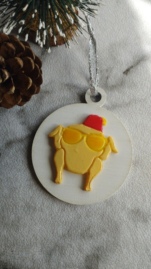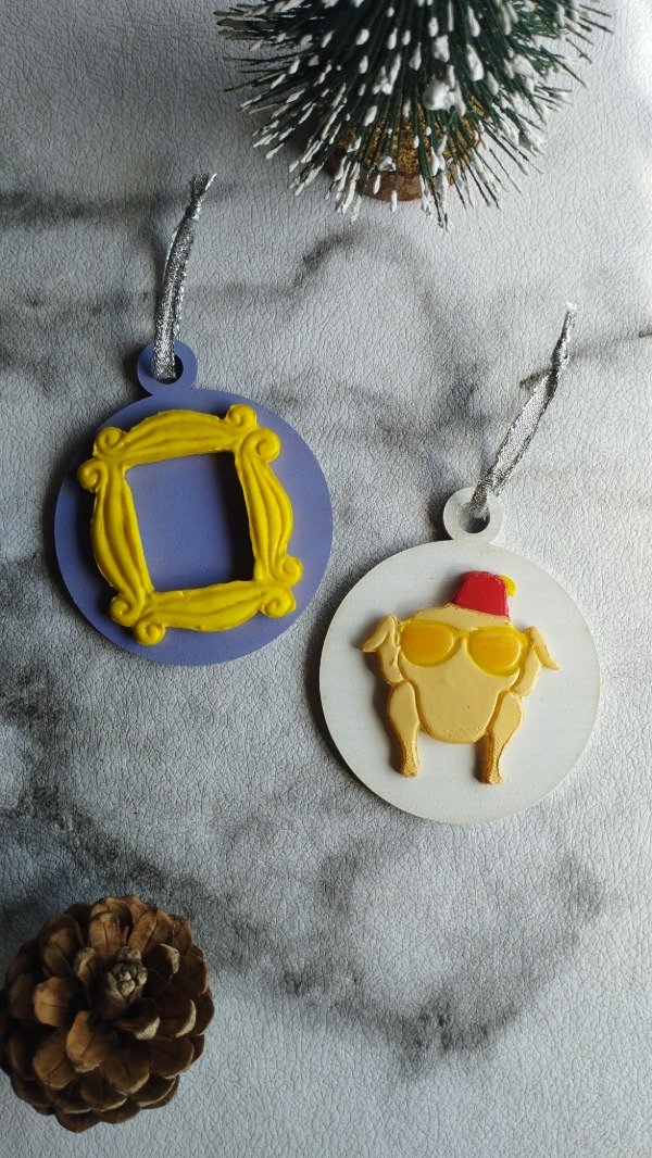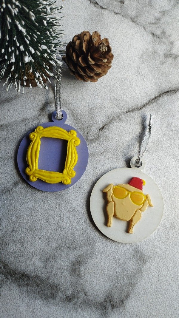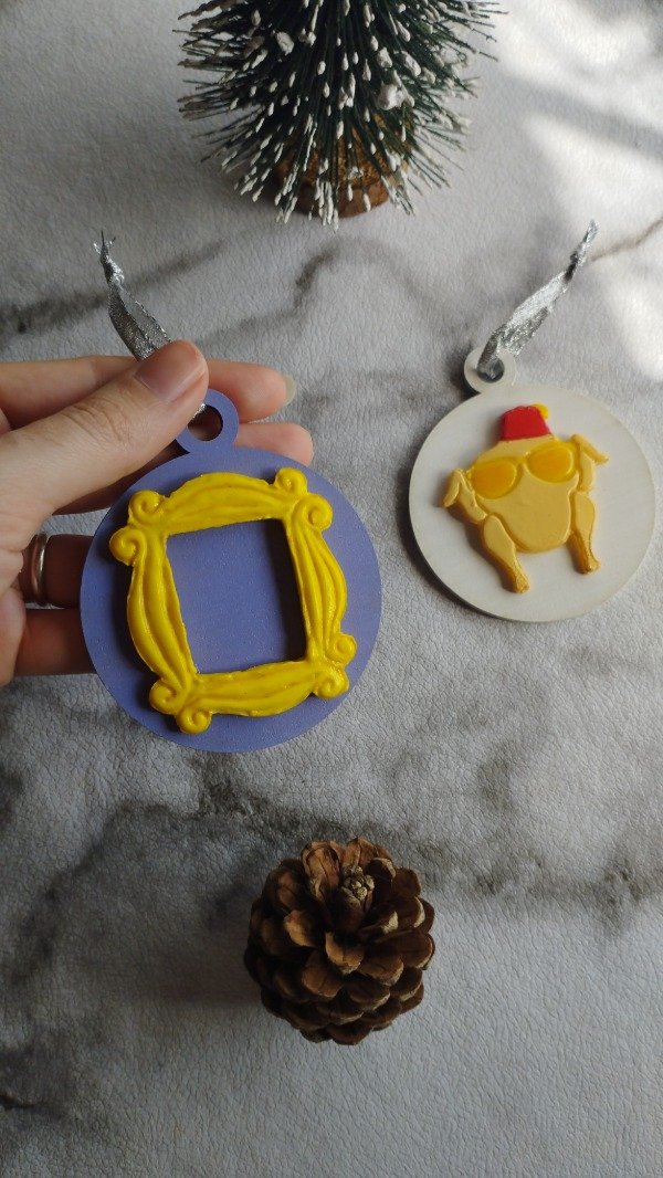 Set de dos adornos. Diseños realizados con porcelana fría sobre base de madera, con detalles en acrílico y barniz. Cada adorno lleva una cinta decorativa para colgar en el arbolito.