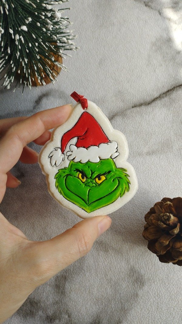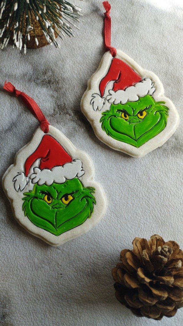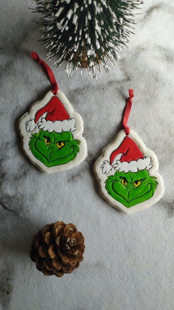Diseños realizados con porcelana fría, detalles en acrílico y barniz. Cada uno lleva una cinta decorativa para colgar en el arbolito.