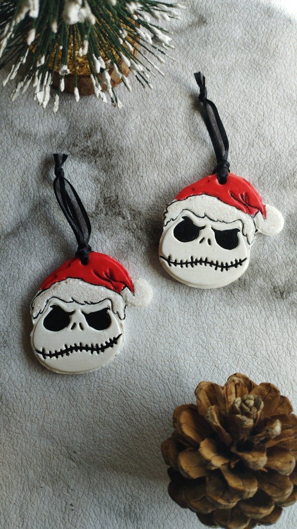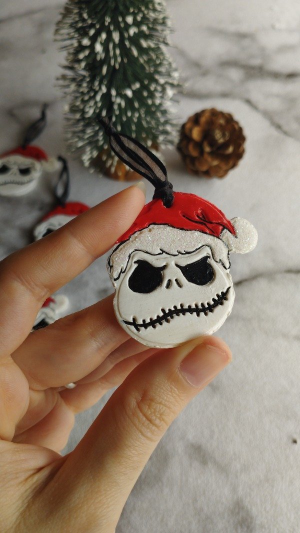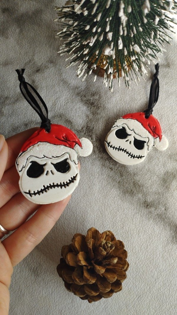 Diseños realizados con porcelana fría, detalles en acrílico y barniz. Cada uno lleva una cinta decorativa para colgar en el arbolito.